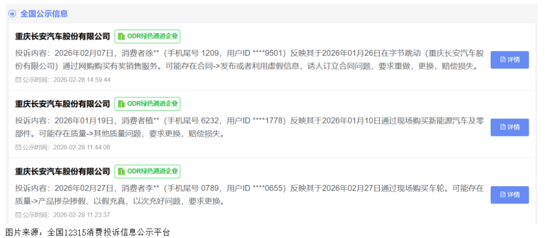 近日,12315投诉公示平台显示,长安汽车新增3件投诉公示,核心直指产品掺杂掺假、以假充真、以次充好等严重质量问题。