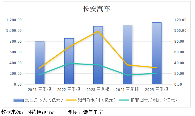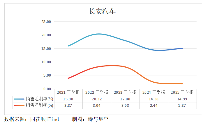 2025年前三季度,长安汽车归母净利润为30.55亿元,同比下滑14.66%;即便扣除非经常性损益后归母净利润为20.18亿元,同比增长20.08%,但整体净利率仍徘徊在1.87%的低位。