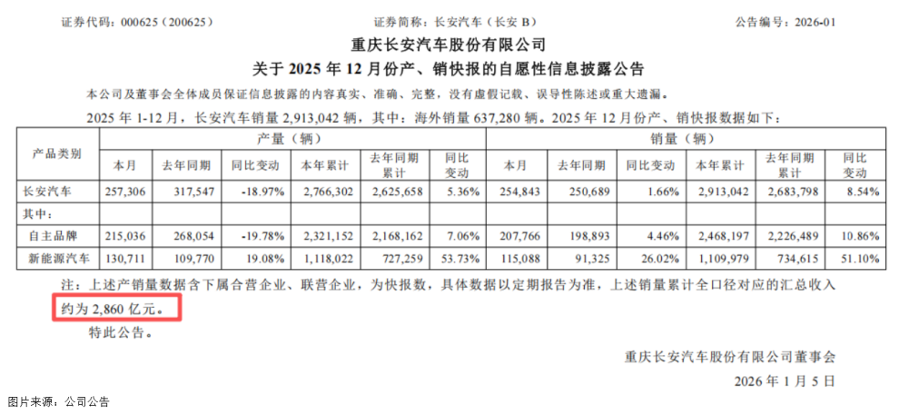 根据公司公布的12月产销快报显示,2025年长安汽车全年营收约为2860亿元,销量更是达到了291.3万辆的惊人数字,同比增长8.54%,创下了近九年来的历史新高。